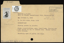 Description:   Restored in plaster. Plump body; round bottom; short neck; flaring rim with groove on top to receive lid; double handle with rotelle.