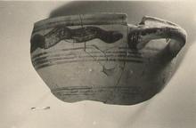 Description:   About one-third of body preserved, with one handle. Convex body, thickened rim, and horizontal rolled handle. The rim glazed; a wavy band in the handle zone. The body banded with sets of quadruple lines. Broad bands inside.