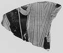 | Description: | a) Rim fragment shows the upper left side of a youth with a white-painted wreath and a long curl over his shoulder, facing left, and holding a patera in his right hand, toward which is outstretched the hand of another figure. In the field painted in white: Α Λ Ο b) Lower part of a standing draped figure. c) To the left, a bit of a similar figure; to the right, an arm and hand holding a staff. Profile eye; relief contours for the features and principal outlines; reserved hairline. Somewhat grayed and splotchy; relief lines for interior drawing; dilute glaze only for the hair around the face. Good black glaze. On the inner edge of b) a trace of medallion frame with maeander. | |