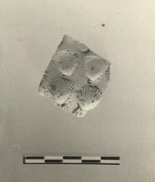 | Description: | From lower side wall. Above a row of leaves, of which only tips preserved, three rows of shells. Buff clay. Glaze almost entirely missing. | |