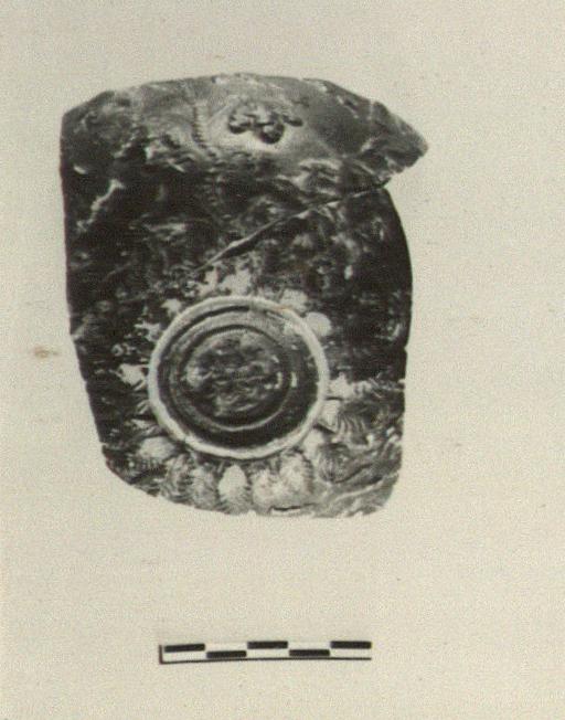 | Description: | Base and about one-fifth of lower side wall preserved. Double rosette in base medallion, ridges and scraped groove around; above, a double row of fronds, from which rise grape vines, probably originally four, dividing the side wall into four panels; above the fronds, hares and hounds; then, in each panel, at least one large figure (part of one draped female and one nude male figure preserved), with tripod and bird in field. Pinkish-buff clay. Glaze on inside fired brown to red. | |