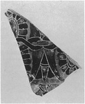 | Description: | From wall of closed vase of thin fabric. Fragment of lotus and palmette decoration in purple and black with careful incision. Panther's head right below. Fine pink clay; inside unglazed. | |