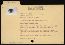 | Description: | Full profile preserved, with bottom and a small part of rim and wall. Restored in plaster. Flat bottom with groove near edge; straight slightly insloping sides with groove just below lip. Reddish-buff clay. Metallic black glaze. Perhaps a kyathos? | |