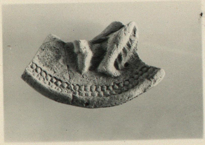 | Description: | Small fragment with part of rim and ring foot. Plain rim, bordered inside by double row of raised nodules. In relief inside, feet and legs of a dancer(?). On the bottom, a relief rosette with two moulded rings inside the foot. Buff clay and red glaze, almost entirely peeled from inside. | |