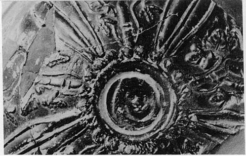 | Description: | About half of wall and rim restored in plaster. Gorgoneion in medallion; on body, large pointed leaves alternating with grape vines bearing leaves and clusters; band of guilloche above. Scraped lines below lip and around medallion. Dull black glaze, in places peeled. | |