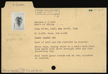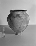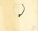 | Description: | Part of wall and rim restored in plaster. Ovoid body, ending below in a small knob foot. Wide mouth with short straight neck and flat projecting lip. Dull black glaze inside and on rim; splashes on outside. | |
