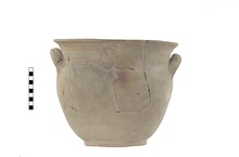 | Description: | All of the lower part and much of the upper part with one handle, restored in plaster. Deep, slightly round body, wide straight neck; flaring lip, flat on top, save for a light groove around inner and outer edges. Rolled horizontal handles on the shoulder, against the neck. Remains of banded decoration in dull red: a band at top and bottom of neck, and a wavy band on shoulder, with tails at the handle. Pinkish clay, light buff slip. | |