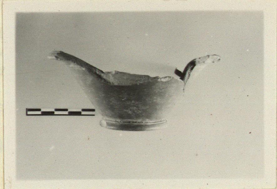 Description:   Small bowl on ring foot; flaring wall; keeled rim, the latter broken off. Foot neatly grooved and moulded beneath; grooves on underside of keel; edge rouletted.