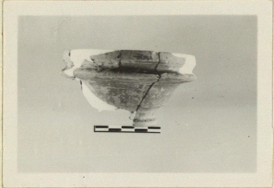 | Description: | More than half missing; restored in plaster. Ring foot, flaring wall and keeled convex rim. Local imitation of Sigillata; poor dull red glaze; soft buff clay. | |
