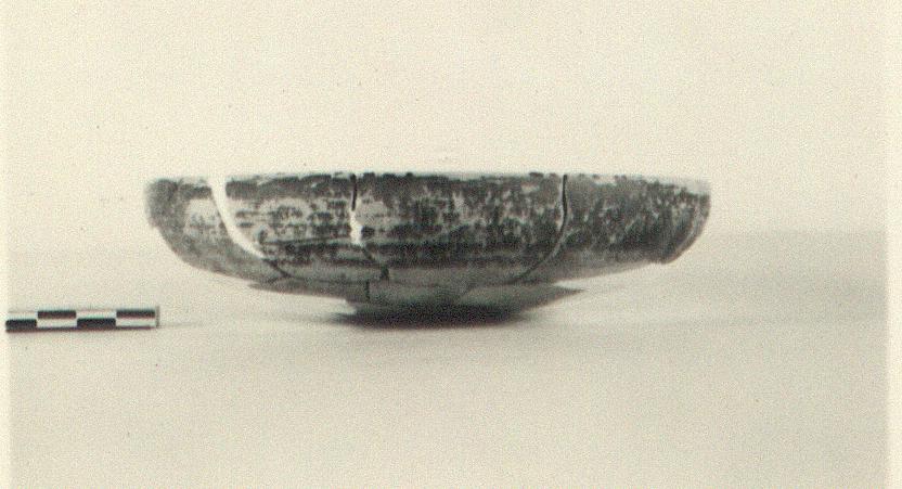 | Description: | Full profile preserved; missing pieces filled out in plaster. Plain phiale with low boss. Outside reserved, except for band around rim; poor black glaze on inside very badly flaked. Soft buff clay. | |
