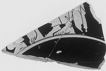 Description:   From the floor. On inside, part of maeander border and the lower legs of a figure facing left. Large plain exergue. Streamers, once white, in the field. On outside, feet of two figures facing left, and part of drapery (cloak) of the right-hand figure.