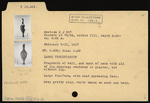 | Description: | Fragments of wall, and much of neck with all of lip, missing; restored in plaster, but without lip. Large fusiform, with neat spreading foot. White bands on neck and body. Gray gritty clay. | |