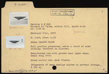 | Description: | Full profile preserved, about one-third of side missing. Restored in plaster. Downturned rim with groove near upper edge; small ring foot. Glaze mostly red, much flaked. Fragments of many similar plates in pottery storage, B 150 c. | |