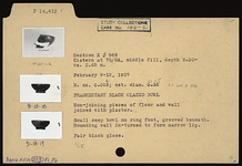 | Description: | Non-joining pieces of floor and wall joined with plaster. Small deep bowl on ring foot, grooved beneath; rounding wall inturned to form narrow lip. Fair black glaze. | |