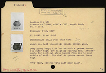 | Description: | About half preserved; handle broken away. Flat bottom with a groove around its outer edge; deep plump body; low slightly flaring rim; attachments for vertical strap handle from rim to near middle of wall. Two shallow grooves around lower edge. Gray clay. Covered with matte gray paint. | |