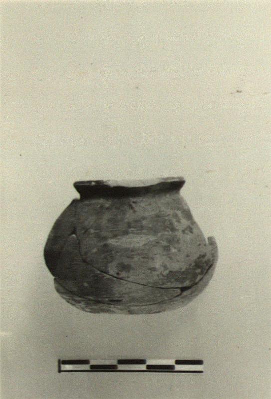 | Description: | About half preserved; handle broken away. Flat bottom with a groove around its outer edge; deep plump body; low slightly flaring rim; attachments for vertical strap handle from rim to near middle of wall. Two shallow grooves around lower edge. Gray clay. Covered with matte gray paint. | |
