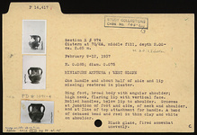 Description:   One handle and about half of side and lip missing. Restored in plaster. Ring foot; broad body with angular shoulder; high neck; flaring lip with vertical face; rolled handles, from below lip to shoulder. Grooves at junction of foot and side, of neck and shoulder and at line of top attachment for handle. A band of debased bead and real in thin clay and white on shoulder.