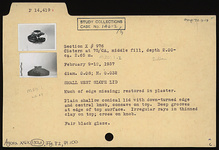 | Description: | Much of edge missing. Restored in plaster. Plain shallow conical lid with downturned edge and central knob, concave on top. Deep grooves at edge of top surface. Irregular rays in thinned clay on top; cross on knob. Fair black glaze. | |