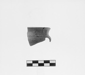 | Description: | a) Bit of shoulder and concave rim with out-turned lip. Base of handle attachment on outside of rim suggests a horizontal strap handle. Thin hard buff to brown clay. Black to gray wash on inside, splashes of same on outside. Non-joining rim piece in envelope in B 150a. ADDENDA b) Χ 1139: Lot X 150c. Inventoried 13 March 1991. Non-joining part of P 14425 (Χ 982), preserving ca. one-third of rim. | |