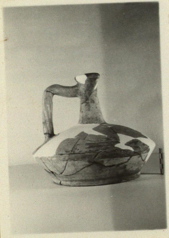 | Description: | Made up from many pieces; restored in plaster. Low ring foot; broad angular shoulder; flaring rounded lip; grooved, slightly twisted handle. Broad bands of red around foot and shoulder, and on lip. Buff to pinkish-buff clay. White ground much flaked. | |