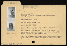 | Description: | Mended from many pieces. Restored in plaster. Flat bottom, projecting, and with a small slightly upturned flange at its top; straight sides; inset lip to receive lid. Buff to pinkish-buff clay. White slip much flaked. Parts of red and brown stripes on lower side wall. | |