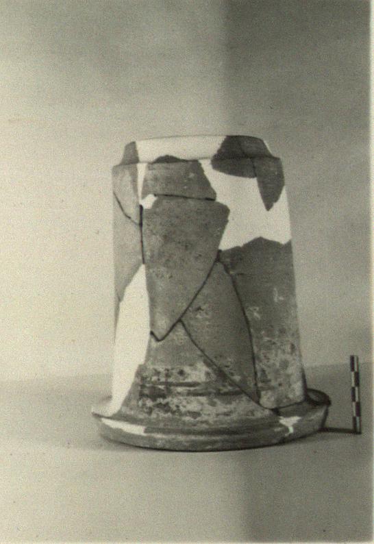 | Description: | Mended from many pieces. Restored in plaster. Flat bottom, projecting, and with a small slightly upturned flange at its top; straight sides; inset lip to receive lid. Buff to pinkish-buff clay. White slip much flaked. Parts of red and brown stripes on lower side wall. | |