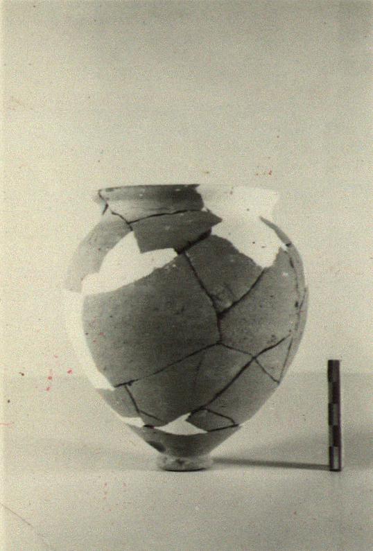 | Description: | About half of rim and fragments of wall missing. Restored in plaster. Small flat-bottomed knob as base; deep ovoid body; short concave neck; flat-topped rim. Buff clay. Traces of black glaze on inside. | |