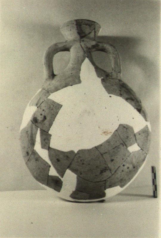 | Description: | No part of bottom preserved; pieces from sides and lip also missing. Restored in plaster. Both sides, shallow convex; short narrow neck with high flaring lip; two grooved handles. Ridge at base of lip on line of upper handle attachment. Traces of concentric circles in red on sides. Gritty clay, orange-red on inside, with light buff surfaces. | |