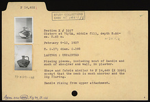 | Description: | Missing pieces, including most of handle and much of shoulder and wall, restored in plaster. Shape and fabric similar to P 14449 (Χ 1006), except that the neck is much shorter and the lip flaring. Handle rising from upper attachment. | |
