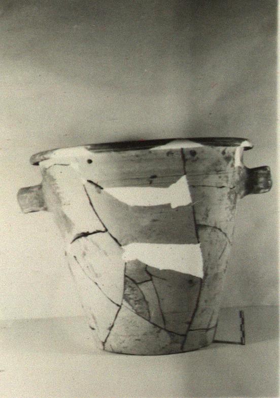 | Description: | A few pieces, including part of rim, missing; restored in plaster. Flat bottom; straight slightly flaring sides; flat-topped rim with downturned edge; heavy horizontal loop handles on upper wall. Grooves at line of handles and above. Reddish to pinkish-buff clay. Red wash on inside, on rim and on handles; splashes on outside. Mended in antiquity with lead clamps. | |