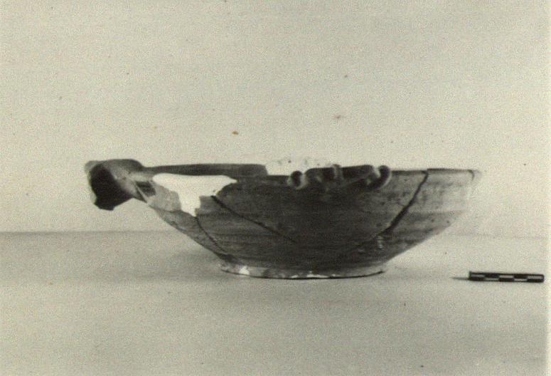 | Description: | Large fragment of rim, with one lug, missing. Restored in plaster. Low ring foot; rounded wall with plain rim; fluked spout; one lug handle preserved, consisting of pierced rectangular projection fastened on, as it were, by three small strips of clay. One fluke of the spout is pierced, the other partly pierced. Coarse buff to pinkish-buff clay, with remains of lighter surface, worn. | |
