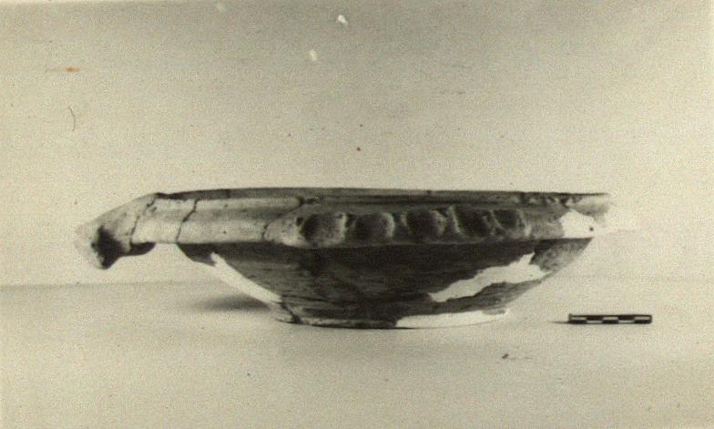 | Description: | Few pieces missing, including part of one lug. Restored in plaster. Low ring foot; rim similar to P 14455 (Χ 1012), but with pie-crust lugs. Light red clay with bits in it. Light slip. Red stain on floor. | |