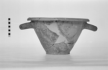 | Description: | Few pieces missing, including part of rim. Restored in plaster. Low ring foot; steep sides; downcurved rim; heavy horizontal rolled handles. Pinkish-buff clay. Thin red glaze on inside, on rim and on handles; splashes on outside. Broken and mended with lead clamps in antiquity. | |