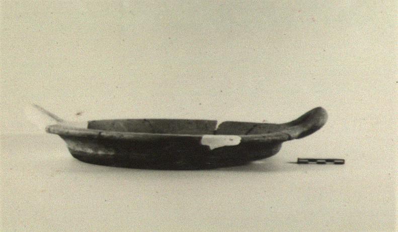 | Description: | Pieces of floor and part of rim, including perhaps one handle, missing. Restored in plaster, with second handle. Broad flat floor; low flaring sides with flat-topped projecting rim; loop handle attached to rim. Gritty red clay. Heavy fabric. ADDENDA There are fragments of at least two more in the tins. | |