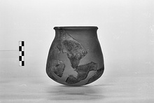 | Description: | Most of rim and sides missing. Restored in plaster, with vertical handle. Small deep, fat, pear-shaped, with short straight neck and narrow out-turned lip. Gritty red clay; surface gray to black. Fragment of similar pot, of thick gray clay, in tray B 149b. | |