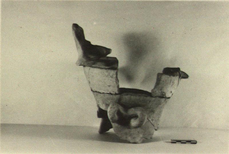 | Description: | Of upper bowl, two large rim pieces, including two heads, missing; start of stand but none of base preserved. Restored in plaster. Sharply keeled rim, with one bearded head lug. Four holes in floor. Two horizontal handles, bent back against wall, preserved at top of stand. Gritty red clay. Light slip on outside. Fragments of several others, including a base, in Tin 158. | |