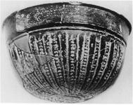 | Description: | Base medallion and slightly less than half of sides and rim preserved. Restored in plaster. Base medallion worn, separated from wall by two grooves; on sides, thin leaves separated by jewelled lines. Plain rim separated from side by deep grooves; out-turned lip. Pinkish-buff clay. Black glaze, much worn on outside. | |