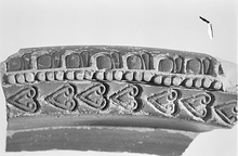 | Description: | Rim fragment of a large plate or bowl. Projecting rim stamped on upper face: leaf pattern on inner edge, raised ridge with beading; egg and tongue on outer edge. Pergamene. | |