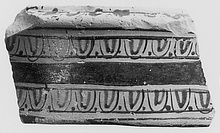 Description:   From the outer part of the handle for a large lekanis; on the top, egg pattern; on the vertical face, two bands of egg and dot. Lower edge glazed black; red wash on inner face.