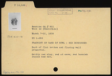 | Description: | Part of flat bottom and flaring wall preserved. Gritty red clay, red at core; red burnish inside and out. | |