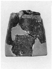 | Description: | Mended from several fragments; the full height of the stand preserved, with a trace of the start of the pot above. Plain nearly cylindrical stand, spreading slightly to plain edge below. A hole pierced through one side a little below top. Gritty red clay with heavy gray core; red burnish outside. | |