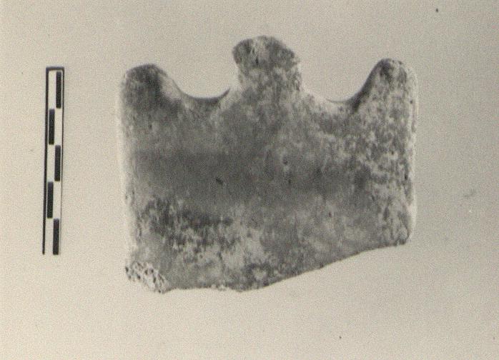 | Description: | Heavy vertical(?) lug handle, made in two pieces joined towards the top, the upper edge scalloped, leaving three rounded projections. Gritty gray to brown clay; rather dull red to black burnish. | |