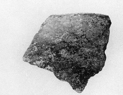| Description: | Fragment of deep bowl; wall convex; lip slightly out-turned. Gritty gray to brown clay; black to brownish burnish inside and out, worn. | |