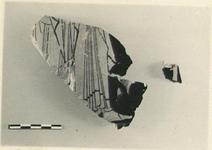 | Description: | a) Wall fragment broken all around. Remains of the lower part of a draped female figure, moving right, above a narrow purple band. Sparing use of thinned glaze for interior lines. b) A small non-joining fragment preserves part of a long narrow object, staff? No relief contour; dull black glaze outside, rougher inside. | |