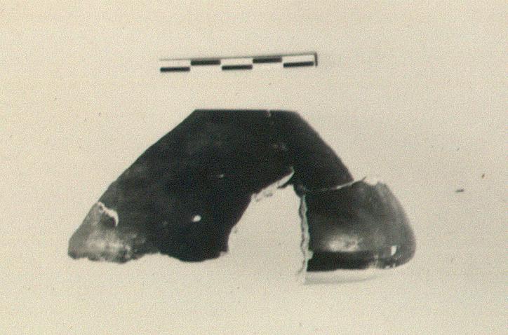 Dull black glaze on the outside only; hard brownish-buff clay, gray core.