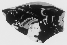 Description:   Fragment from upper wall, broken all around. Head of woman to right, her right hand raised behind her head; vine tendrils above. At the right of the fragment, part of a thyrsos. White for flesh and tendrils; thinned glaze for eye, hair, earring and necklace.