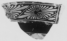 | Description: | From the rim of a column krater; trace of handle attachment at right. Slanting palmette pattern on the slightly concave outer face; on the top, a wreath of olive, leaves and berries in white, stems in added clay; the wreath interrupted by an encircled palmette, between long narrow petals, all in red figure, on the handle plate. Band of egg and dot around the neck. Fine red clay and good metallic glaze, worn. | |