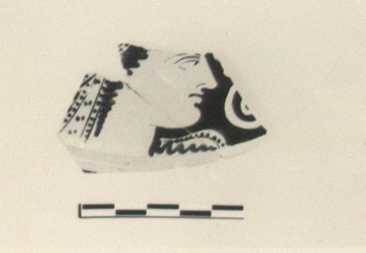 | Description: | (a) Fragment from top, set off from wall by two unglazed grooves. Large-scale head, with long curls and a dotted tiara, to right; at right edge, part of a spiral ornament. Thin metallic glaze. ADDENDA Three more non-joining fragments giving most of another woman's head wearing sakkos, earring and necklace, left. b) Upper part of face and part of the sakkos. c) Lower half of the face and part of floral ornament in front of it. d) Part of hair, earring, sakkos and neck; tiny part of ornament behind the head. | |