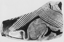 Description:   Fragment from the top, preserving much of a griffin, seated right. Head, tops of wing, and front part missing. Relatively careful work.