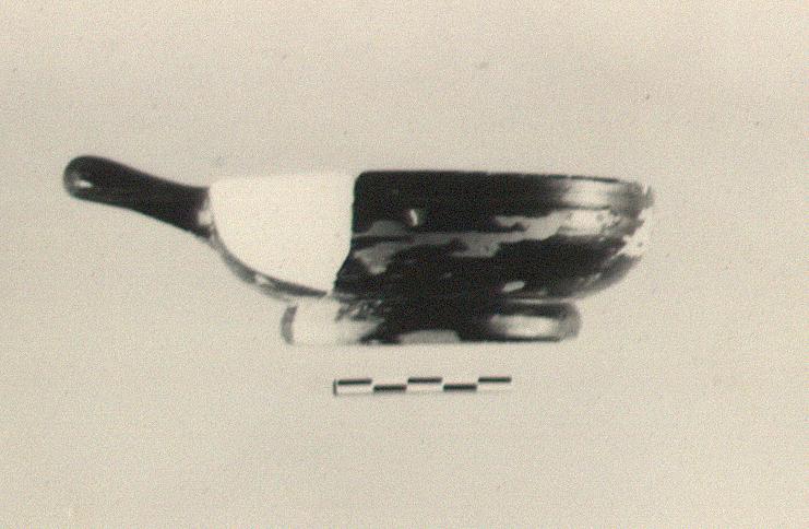 | Description: | Two small fragments of rim and wall missing; restored in plaster. Ring foot, roughly rounded wall, lip flat on top; handle spreading from attachments, and tilted well above lip. Inscribed beneath, within foot: <graphic> Glaze, carelessly applied and considerably peeled outside; not completely covering foot; splashes on underside. | |